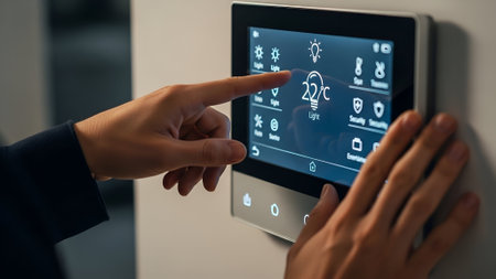 A person's finger touches a digital screen on a wall-mounted smart thermostat, controlling home climate and lighting.