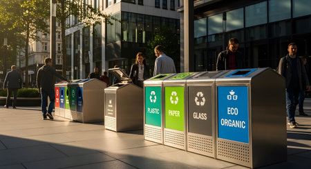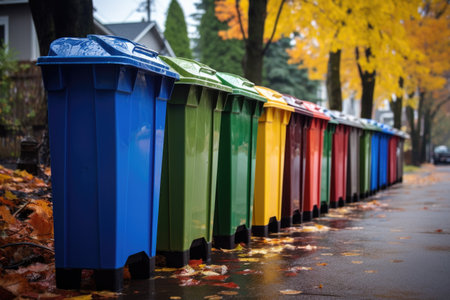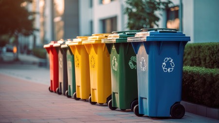 A row of colorful recycling bins lined up on a city street, encouraging proper waste segregation with clear labels for paper, plastic, and glass.