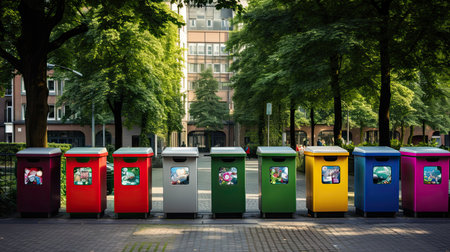 A vibrant row of colorful waste bins stands prominently in an urban setting, providing an organized solution for waste disposal and promoting sustainability in the community.