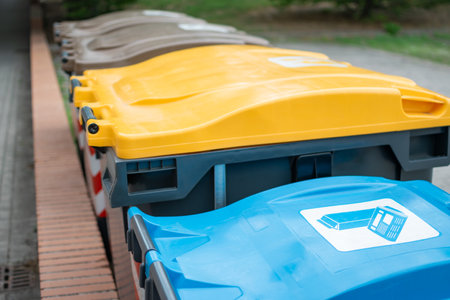 A perfectly aligned row of vibrant red, blue, yellow, and orange recycling bins stands ready for use. This image represents a systematic approach to waste management, environmental responsibility, and the importance of sorting materials for a sustainable future.