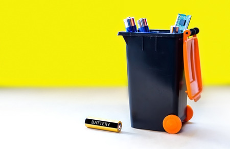 Problematic toxic waste concept, Miniature trash bin filled with batteries electronics