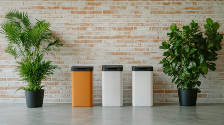 A row of colorful rubbish bins for sorting waste in a clean environment, with space for copy.