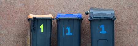 A row of colorful waste bins stands against a gritty concrete wall, emphasizing urban sustainability and the importance of proper waste management practices in our communities.