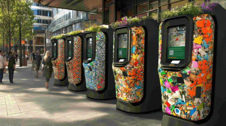 Colorful recycling bins filled with various waste materials stand in a lively urban environment, emphasizing the importance of sustainability and eco-awareness in city life.