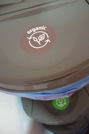 Waste recycling concept. Containers for metal, glass, paper, plastic, organic for further processing of garbage. Separate garbage collection in mall.