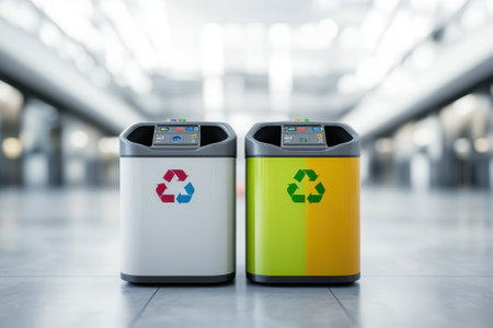 Two recycling bins in a contemporary building lobby, encouraging waste separation and environmental awareness.