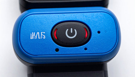 A macro shot of a compact blue wearable device, its central power button ready for activation.