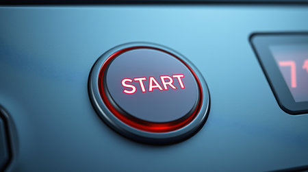 Close-up of modern start button with red LED illumination on blue metallic surface. Perfect for technology interfaces, gaming concepts, power controls and digital design projects.