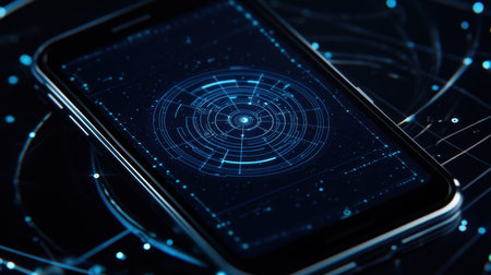 A sleek smartphone rests on a dark digital interface adorned with glowing geometric patterns, representing modern technology and innovation in design.