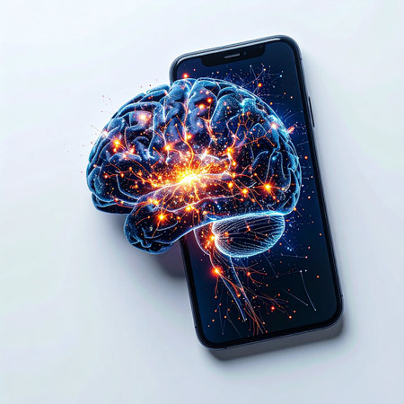 A glowing digital brain, representing a powerful artificial intelligence, emerges from a smartphone screen.