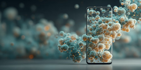 Glowing abstract molecular structures emerging from smartphone screen in a futuristic digital environment.