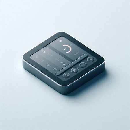 A hand adjusts a smart thermostat with holographic screens displaying temperature and energy...