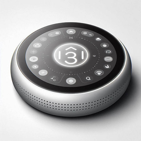 A stylish smart thermostat shows 31 degrees in a well-lit living room adorned with comfortable furniture.