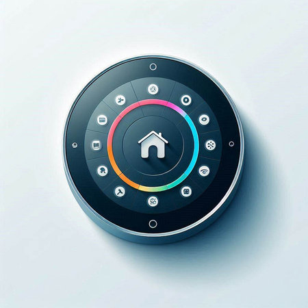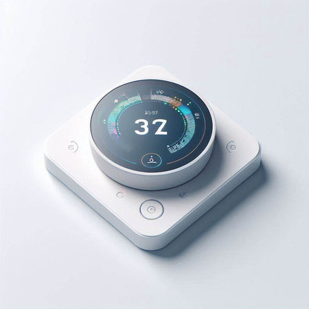 Screen of a smart digital thermostat with the external and target temperatures indicated. Rotary dial to control and adjust. Scheduling and programmable domestic heating. White wall and black frame