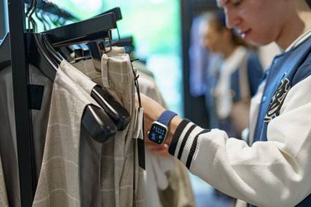 A young man engages with a holographic display in a contemporary retail setting, highlighting the fusion of technology and fashion in shopping experiences.