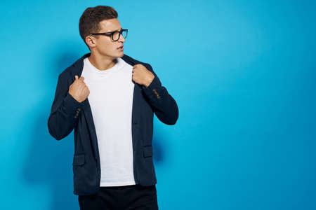 A man chooses a men's suit in a store in a shopping center and looks at the price tag.