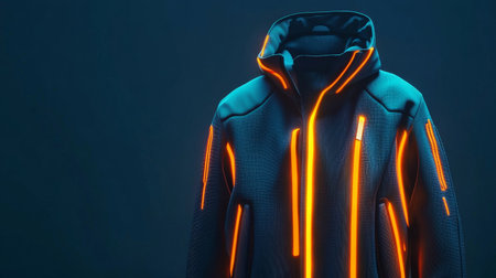 Futuristic jacket glowing with neon orange lights on dark background