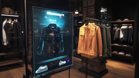 A sophisticated garment display highlights a blend of modern fashion and technology, featuring a digital interface that elevates clothing design.