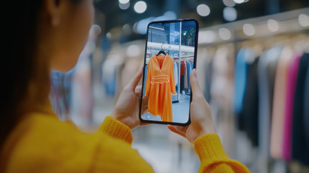 A shopper explores fashion items on their mobile device in a trendy retail environment.