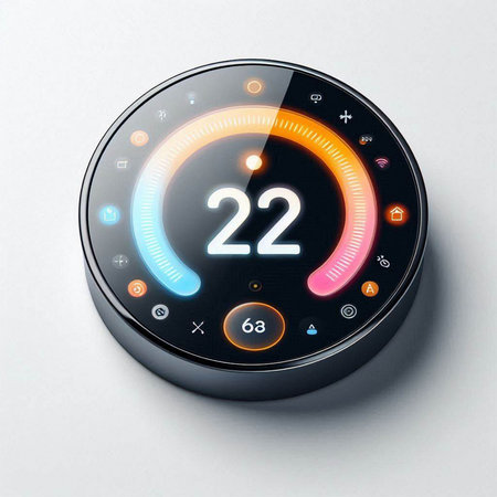 smart home control panel with thermostat in modern living room.