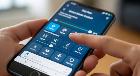 Smart home application on smartphone. Domotic, technology automation, remote control system concept.