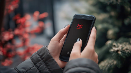 A close-up of a smartphone with a notification count of 200 against a blurred outdoor background. The setting conveys a mix of technology and nature in an urban environment.
