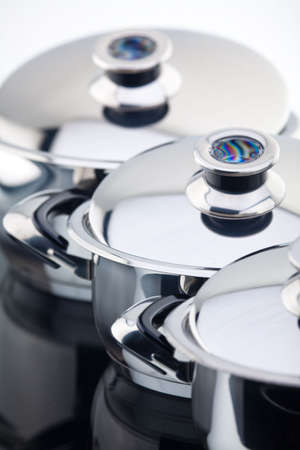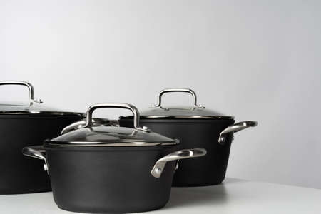 New modern aluminum pots in closeup in the kitchen