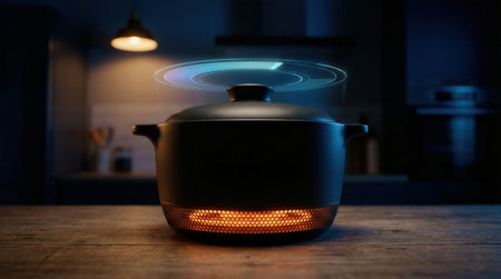 Black cooking pot rests on a wooden countertop with a glowing heating element under the base. Soft kitchen lighting creates a moody atmosphere. Holographic rings suggest smart temperature control and modern culinary technology