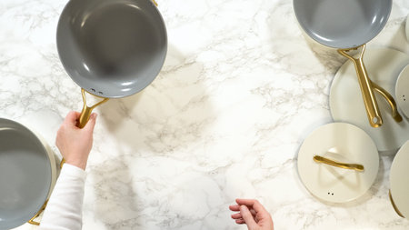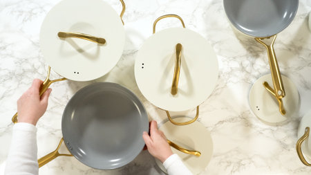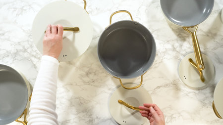 Hands place a white lid onto a nonstick pan with gold handle, set on a marble kitchen surface with other cookware visible.