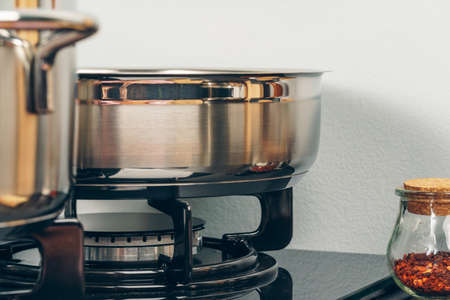 Clean saucepan on a gas stove in kitchen, Kitchen accessories at modern kitchen interior.