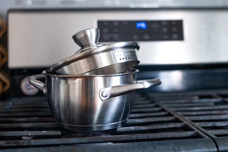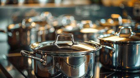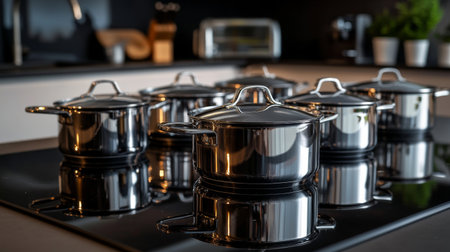 A close-up of shiny stainless steel cookware on a stovetop, reflecting a modern and clean kitchen environment.