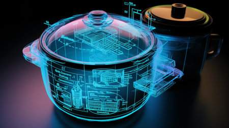 A 3D holographic rice cooker image displays a sleek, compact appliance with a digital control panel and a steaming vent on top.