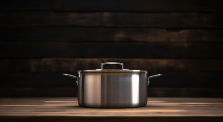 stainless steel pot and lid on a wooden surface.