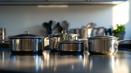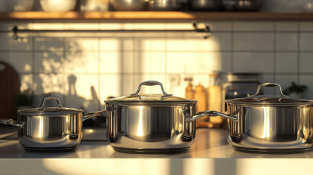 A beautiful kitchen scene with a set of shiny stainless steel pots and pans, reflecting the sunlight, creating an elegant and inviting cooking environment.