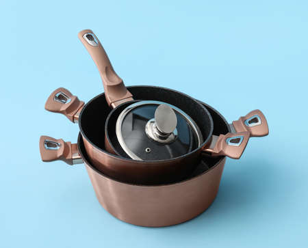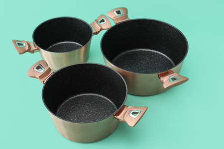 New cooking pots on color background