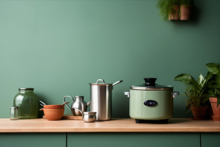 Modern Kitchen: Green Wall Enhances Electric Stove with Cooking Pot on Counter
