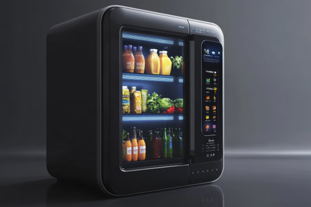 A smart refrigerator in a modern kitchen, with a touchscreen display showing recipes, calendar, and grocery list.