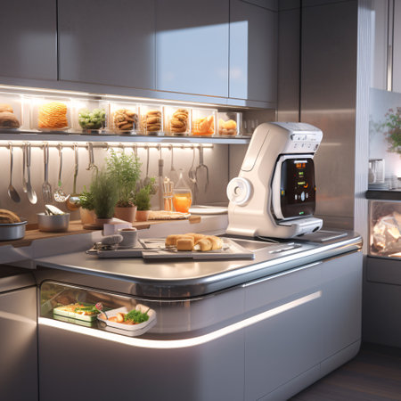 Connected smart kitchen with automated appliances preparing healthy meals.