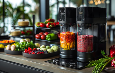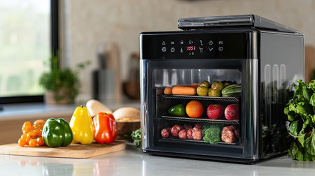 Innovative smart kitchen appliance preparing colorful vegetables on a sleek counter. Modern cooking technology concept with futuristic design, healthy food preparation, and smart home lifestyle.