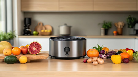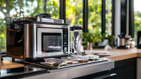 A sleek, high-tech cooking machine on a kitchen countertop with fresh ingredients, showcasing modern culinary innovation and contemporary design for home chefs.