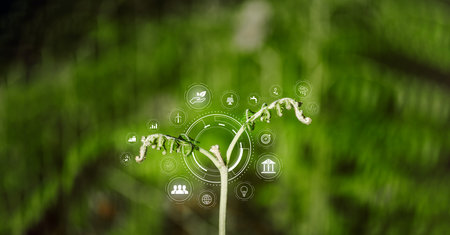 A close-up view presents a young plant emerging from soil, with digital icons overlaid. The warm lighting highlights the natural textures of the soil and foliage. The composition suggests integration between environment, science and technology, suitable for various uses.