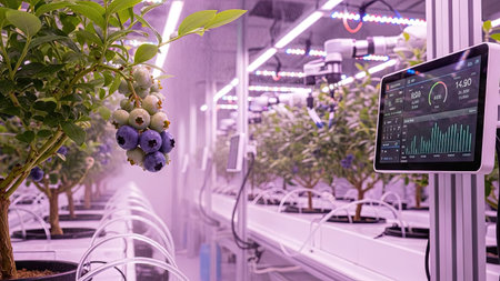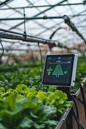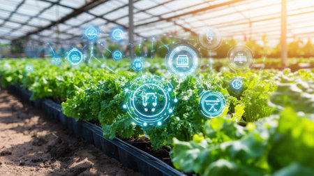 Explore the fusion of innovative technology and agriculture in a greenhouse, showcasing smart farming solutions and data visualization to enhance crop growth and sustainability.
