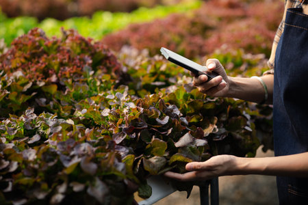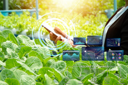 Smart farmer using digital tablet in hydroponic greenhouse with robot arm