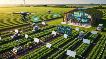 An aerial view shows a modern agricultural scene with drones and robots inspecting crops. The image showcases rows of plants, a small building with digital displays, and automated machinery. The composition features a bright, sunny day, potentially representing sustainable farming practices with applications in technology and innovation.
