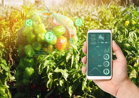 Farmer hold a smartphone on a background of a field with a pepper. Agricultural startup. Automation and crop quality improvement. High technology, innovation. Scientific research.