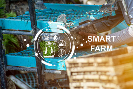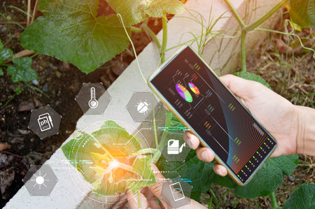 modern farmer using Smart Farming, Farming technology innovation software for new agriculture plant monitor control.