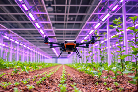 Indoor Farming Innovation. Drone monitoring young plants in vertical farming facility with advanced LED grow lights and automated systems, representing future of sustainable agriculture.