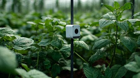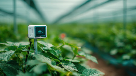 A smart sensor is placed among strawberry plants in a greenhouse, measuring temperature and humidity. This technology aids in optimizing growth and ensuring quality for sustainable farming practices.