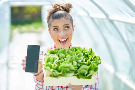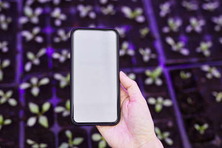 Hand of young female gardener holding smartphone against group of green seedlings growing in large modern greenhouse