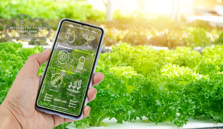 A modern greenhouse showcases innovative technology with smart systems for growing leafy greens, integrating smartphones for plant monitoring and optimal growth.
